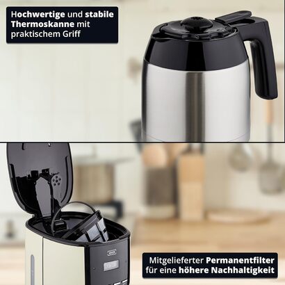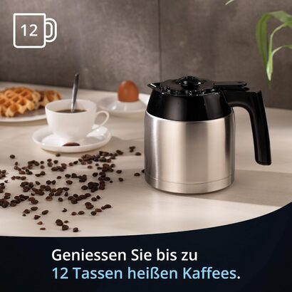 Кофемашина позволяет приготовить до двенадцати чашек кофе благодаря встроенному резервуару для воды объёмом 1,5 литра. Процесс приготовления становится особенно комфортным благодаря встроенному постоянному фильтру и входящей в комплект кофейной ложке. Прочный термос-кувшин с удобной ручкой сохраняет тепло и подходит для подачи до десяти чашек напитка без необходимости повторной варки.