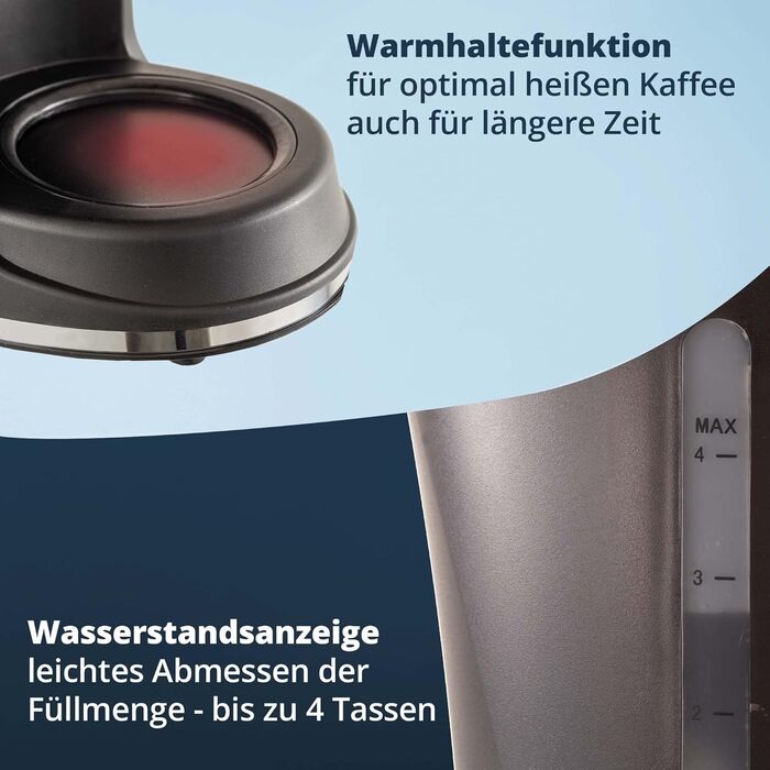 Модель оснащена рядом полезных функций, повышающих удобство и безопасность использования. Встроенная система автоматического отключения срабатывает после завершения приготовления, а функция поддержания тепла сохраняет кофе горячим до подачи. Индикатор уровня воды позволяет точно контролировать наполнение, поворотный фильтр облегчает закладку молотого кофе, а защита от капель предотвращает загрязнение поверхности при извлечении кофейника.