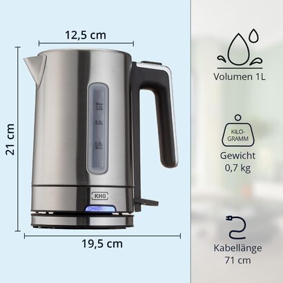 Электрочайник WK-105 ES от KHG — это компактное и мощное устройство, идеально подходящее для быстрого кипячения воды в повседневной жизни. Его объём составляет 1 литр, чего достаточно для приготовления нескольких чашек чая или кофе. Благодаря мощности в 2200 Вт чайник нагревает воду всего за 3 минуты, обеспечивая экономию времени и энергоэффективность.