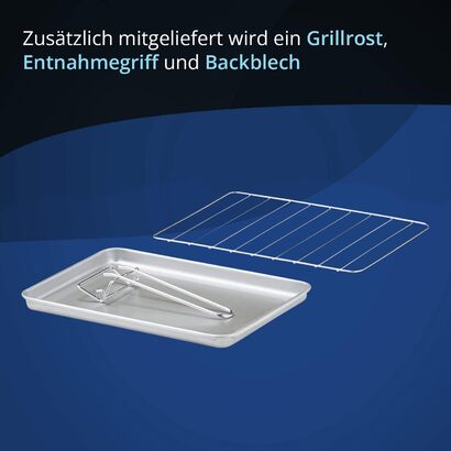 В комплект входят решётка для запекания, противень и съёмная ручка для безопасного извлечения горячих блюд. Всё необходимое для начала использования уже в коробке — просто подключите и готовьте с комфортом.