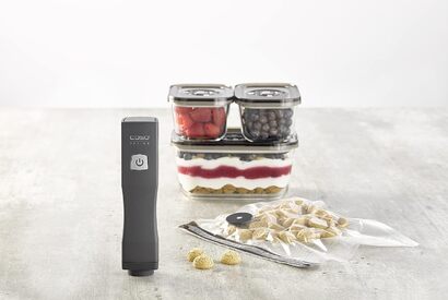 - Множество дополнений: В дополнение к ручному вакуумному упаковщику и набору стекляннх вакуумнх контейнеров, в комплект поставки также входят другие аксессуар: 10 пакетов с застежкой-молнией (5 штук 20x23 см, 3 штуки 26x23 см, 2 штуки 26x35 см), 2 шкафчика на молнии, заряднй кабель USB-C и 4 листа наклеек CASO Food Manager.