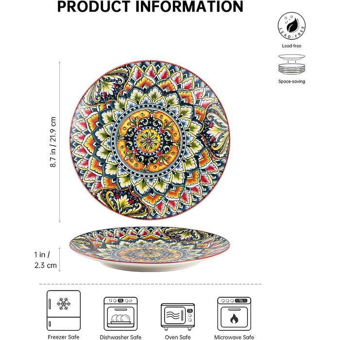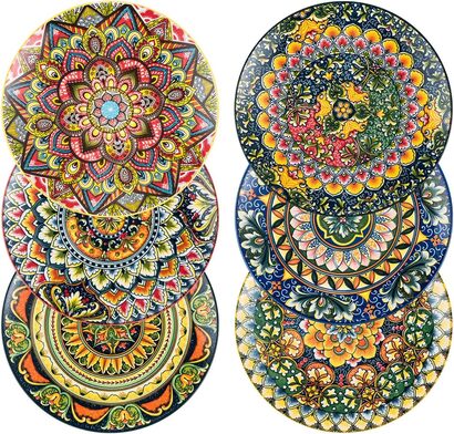 - САМЫЙ КРАСИВЫЙ ДИЗАЙН - По сравнению с простыми пищевыми тарелками того же дизайна, цвета и узоры в каждой из наших плоских тарелок разные, что может придать вашей кухне много ярких красок. Он также привлекает внимание в качестве украшения на шкафу или обеденном столе. Вы будете рады получить эти практичные и красивые плоские тарелки.