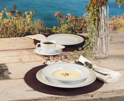 Посуда изготовлена из высококачественного фарфора от Seltmann Weiden. Этот фарфор отличается высокой прочностью, долговечностью и приятной текстурой.