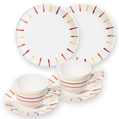 Набор Gmundner для тех, кто любит начинать свое утро с легкого завтрака и любимого бодрящего напитка. В набор входит 2 тарелки для десерта, 2 блюдца и 2 чашки для кофе. Белую глянцевую поверхность набора украшают красочные абстрактные линии, что придает коллекции особую индивидуальность. Набор для завтрака выполнен из прочной керамики, которая не боится высоких температур, мелких царапин и не теряет своей красоты и изумительный блеск после многих лет использования. Набор Gmundner можно мыть в посудомоечной машине и использовать в микроволновой печи. Немецкий бренд Gmundner представляет более широкий выбор коллекции, где вы можете найти предметы, гармонично дополняющие набор для завтрака.