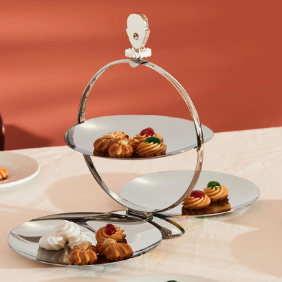 В разложенном состоянии тортовница Fatman Alessi предоставляет тройную поверхность для сервировки, что позволяет разместить на ней достаточно большой торт или несколько пирожных.