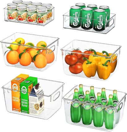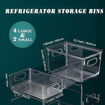 - НАБОР ХОЛОДИЛЬНИКОВ-ОРГАНАЙЗЕРОВ ИЗ 6 - Этот набор ящиков для хранения холодильников включает в себя 4 больших ящика для хранения с прозрачными ручками и 2 маленьких. Размер каждого большого прозрачного ящика составляет 28,6 х 19 х 15 см, а маленького - 25,5 х 15 х 7 см. Большой контейнер для хранения холодильника не штабелируется, а маленький ящик для хранения штабелируется. НЕ ПОДХОДИТ ДЛЯ ПОСУДОМОЕЧНОЙ МАШИНЫ