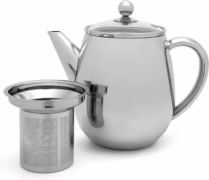 - Небольшой простой серебрянй чайник обемом 1,1 л из нержавеющей стали имеет двойне стенки и оптимально изолирует чай