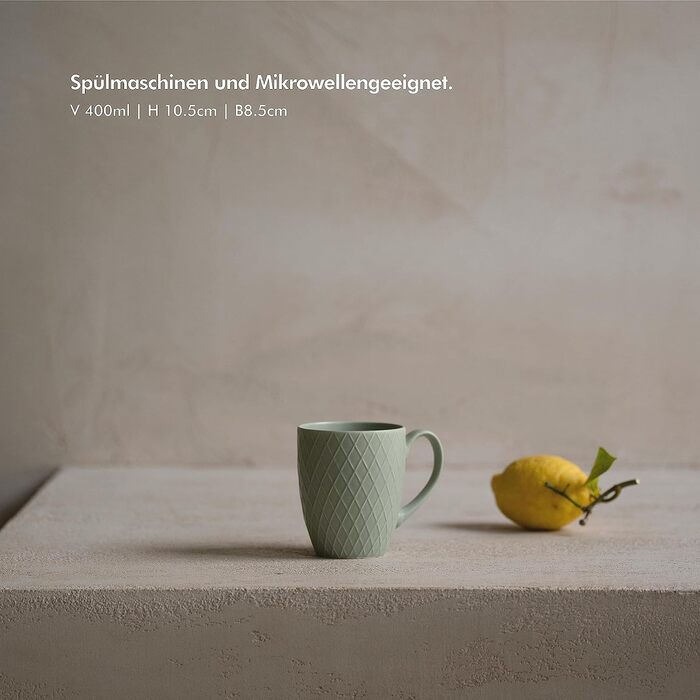 - ДЕТАЛИ И УХОД - Комплект поставки: набор кружек из 6 Стиль: матовый, современный Обем: 400 мл Уход: Микроволновая печь и посудомоечная машина