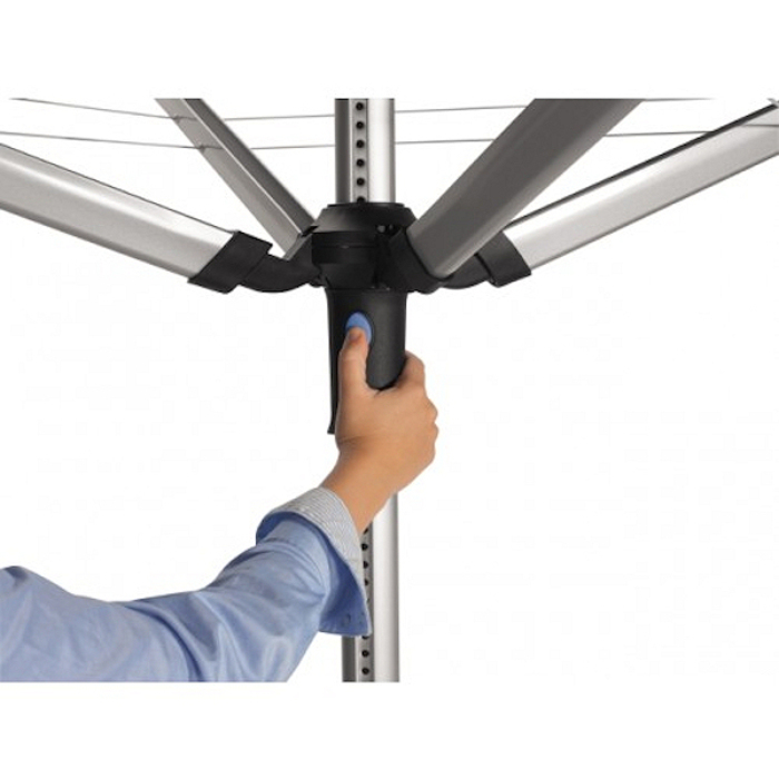 Садовая сушилка с креплением к бетону оснащена простой системой открывания. Все, что вам нужно сделать, это переместить кронштейн вверх и установить высоту, которая подходит вам лучше всего. Система защелок означает, что направляющие можно опускать на высоту до 1 метра, чтобы было легче раскладывать белье. Система «Easy-Lift» позволяет опускать направляющие в диапазоне 149 - 197 см.