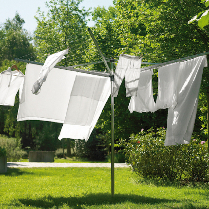 Использование 4-х направляющих в сушилке дает много места для подвешивания одежды - это всего 50 м веревки, которая дополнительно покрыта нескользящим пластиком. Сушилка может свободно вращаться даже при полной загрузке. Сушилка очень легко перемещается. Если вы не используете ее зимой, вы можете снять ее с держателя и хранить в чехле.