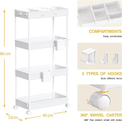 По сравнению с предыдущими моделями, эта тележка SPACEKEEPER оснащена улучшенной конструкцией с 3 видами боковых крючков для подвешивания мелких предметов и 4 свободно комбинируемыми отсеками для индивидуального хранения. Сделайте свой дом более чистым и аккуратным с этой практичной и стильной полкой на колёсиках!