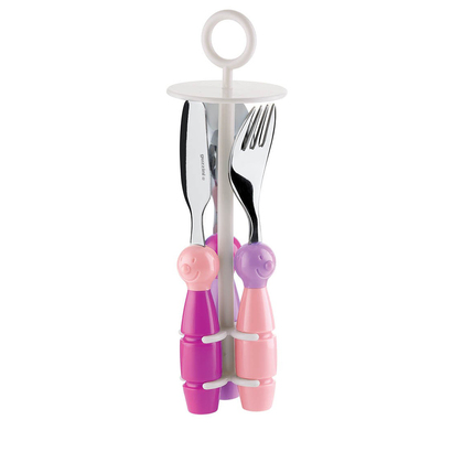 Набор столовых приборов Billo от Guzzini включает в себя ложку, вилку и нож, которые закреплены на специальной подставке. Он имеет отношение к серии детских товаров Bimbi. Все предметы отличаются оригинальным дизайном и яркими цветами. Они создают позитивную атмосферу за столом.
